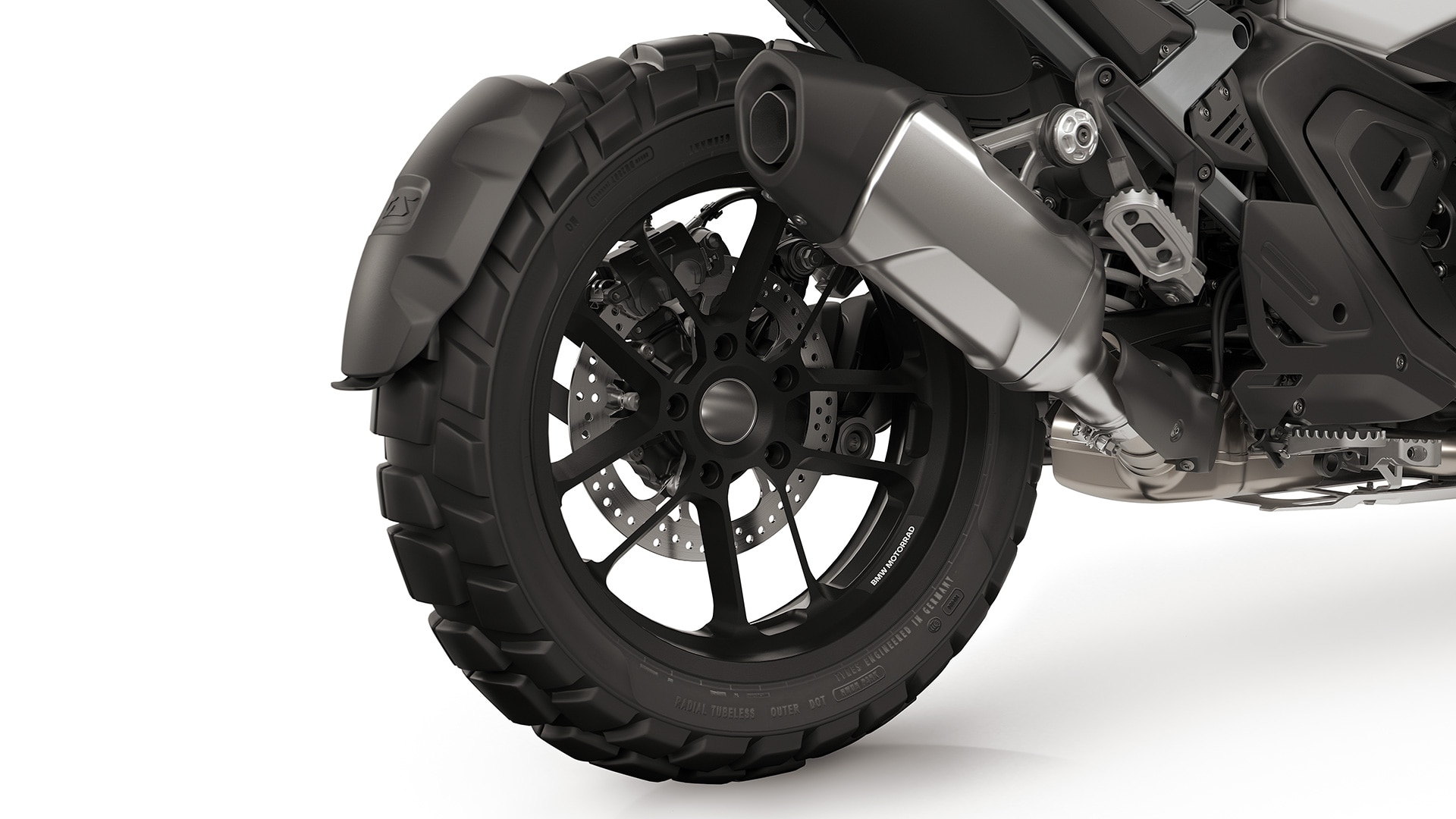 鍛造越野輪圈特別輕量,相比標準輪圈提供了更佳的越野性能。它們具有約1.8公斤的重量優勢和運動風格的外觀。高品質的陽極處理表面上裝飾有BMW Motorrad的品牌標誌